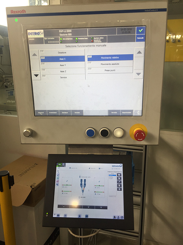 Al fine della sicurezza è stato realizzato un impianto in serie di n°3 barriere ottiche per proteggere la macchina sui laterali e sul lato operatore. Il PC di gestione e il pannello operatore sono di marca Rexroth tipo VPB40.3 e VDP40.3. Il monitor è stato opportunamente ancorato alla stazione mediante braccio di supporto tendo conto dei criteri dell’ergonomia. La programmazione software è stata effettuata secondo standard Opcon. Il PC è stato ampliato con un nodo profibus su cui sono alloggiate schede di ingressi e di uscite digitali.